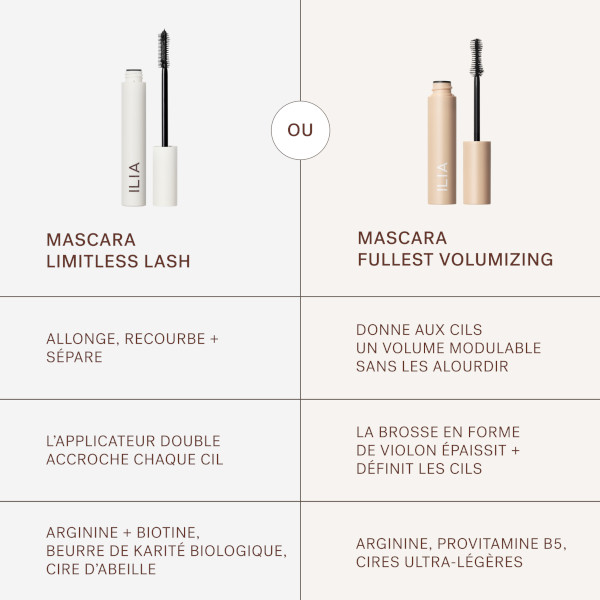 Fullest Volumizing Mascara de la marque ILIA est un mascara volumisant clean, qui enrobe chaque cil d’un volume modulable pour créer une frange de cils à la fois épaisse et légère, et ce sans s’écailler, baver, ni irriter les yeux, même les plus sensibles.